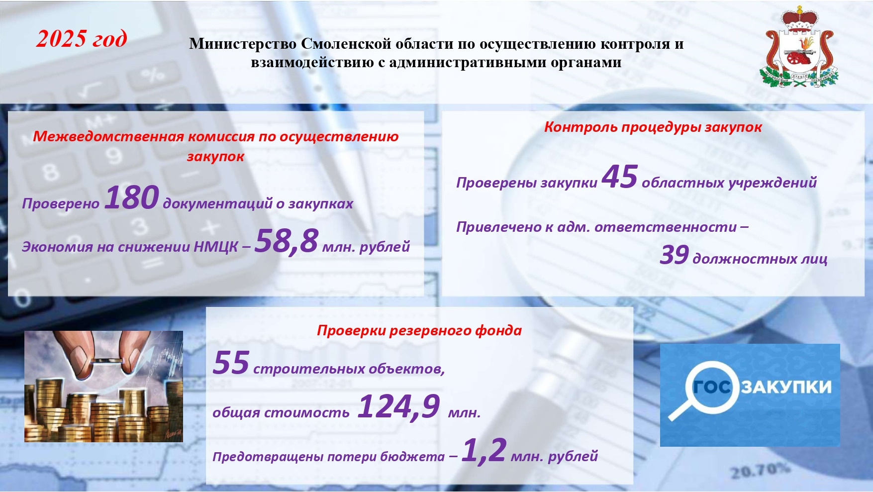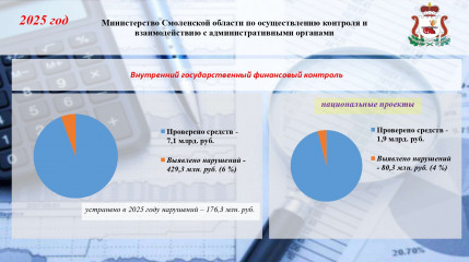 По результатам проверок расходования средств резервного фонда Правительства Смоленской области осуществлен предварительный контроль 55-ти строительных объектов на общую сумму 124,9 млн. рублей. Сумма предотвращенных потерь бюджета составила 1,2 млн. рублей.